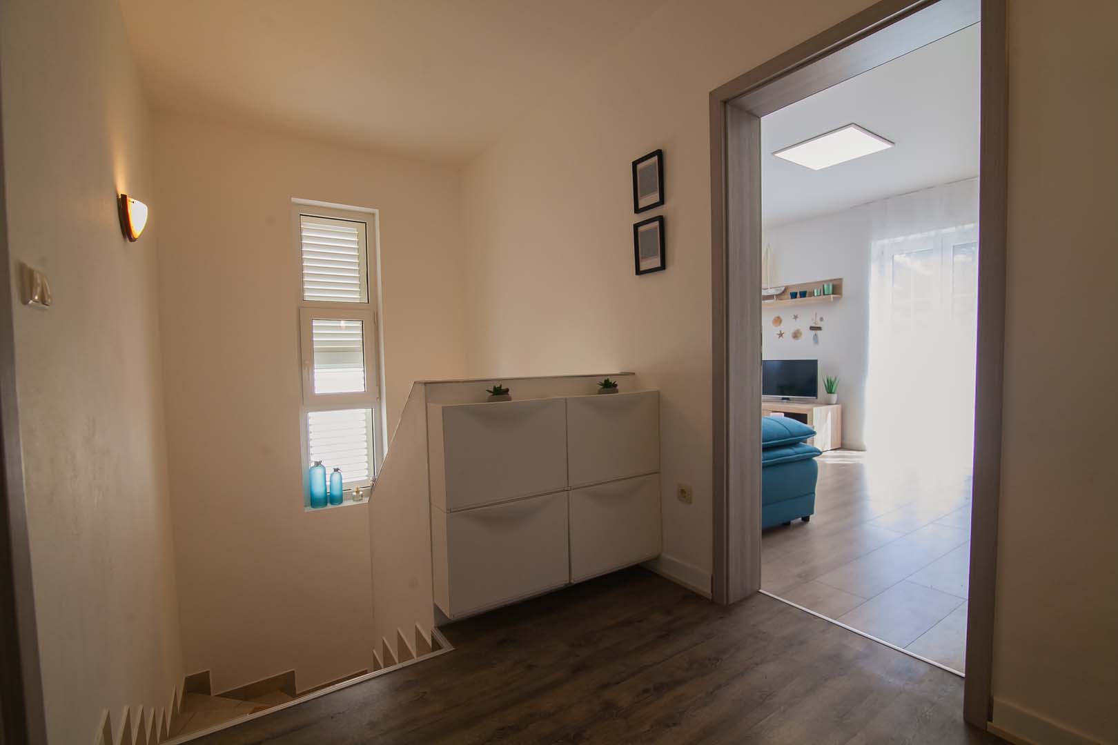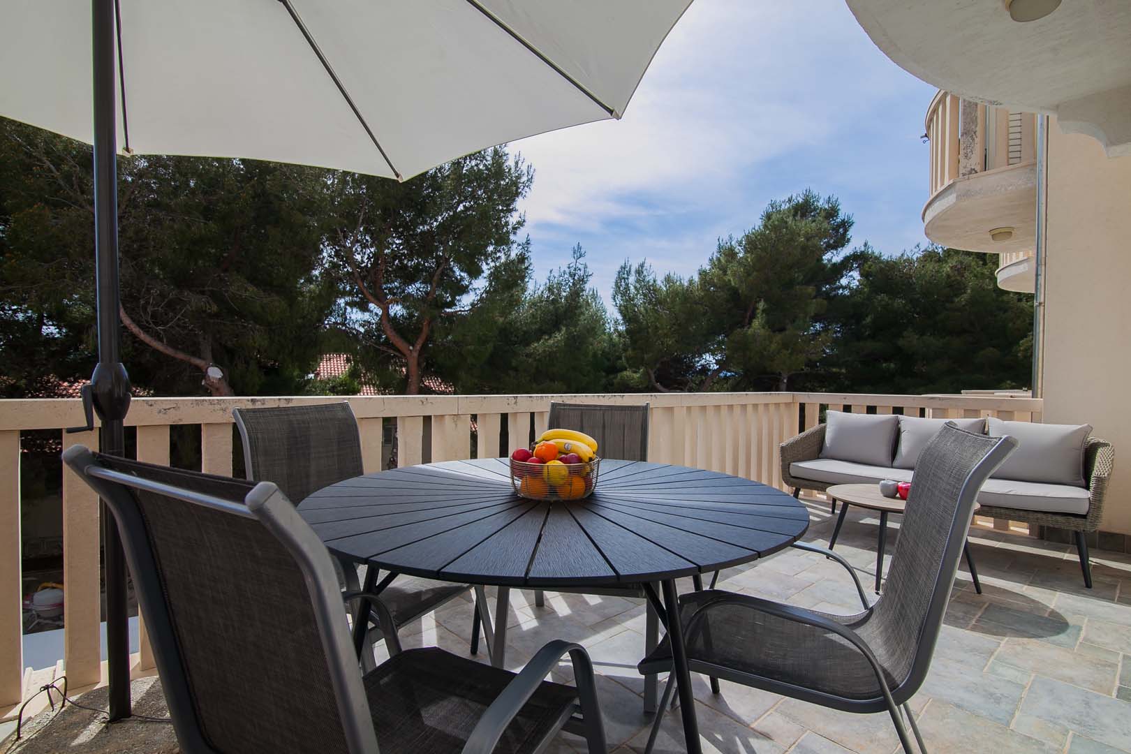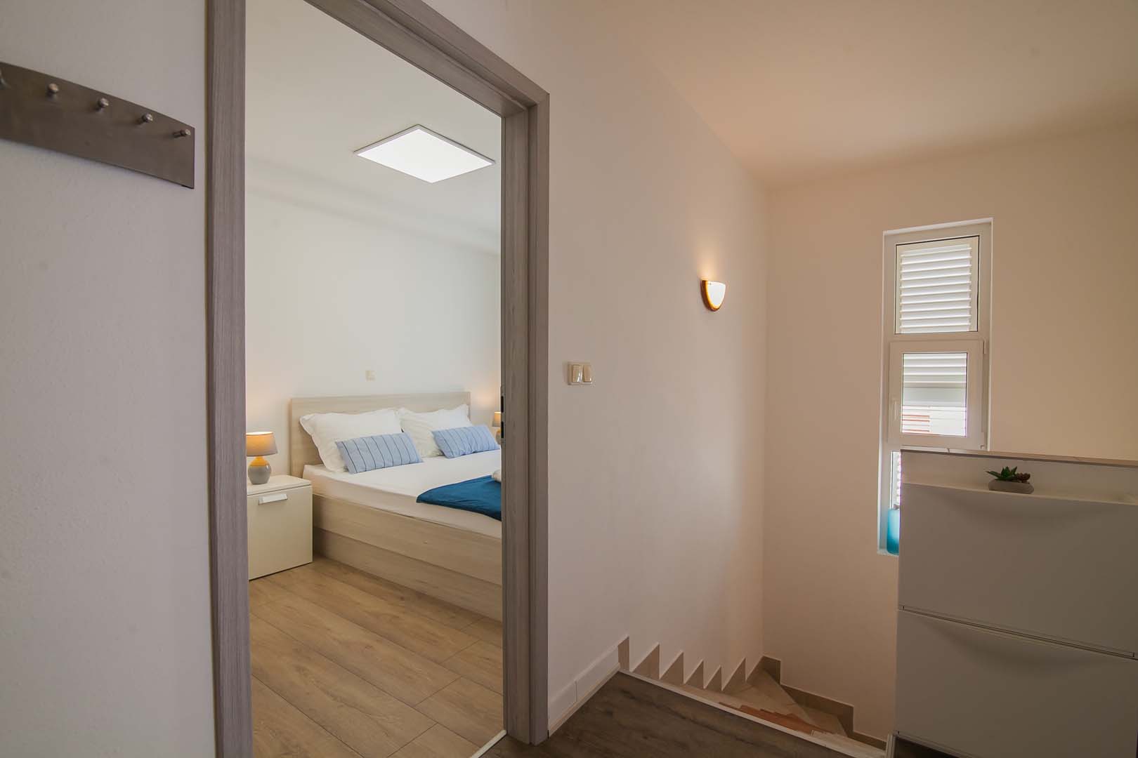 Nalazi se na 1. katu. Na južnoj strani ima veliku terasu i balkon s pogledom na more.
