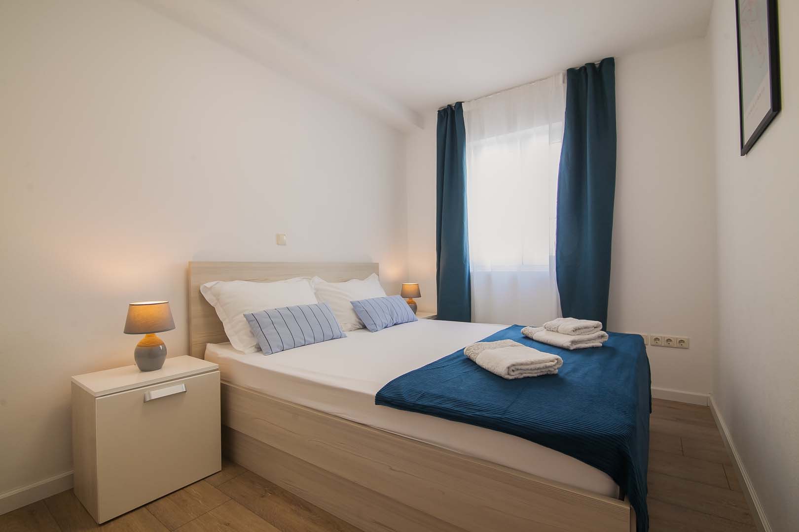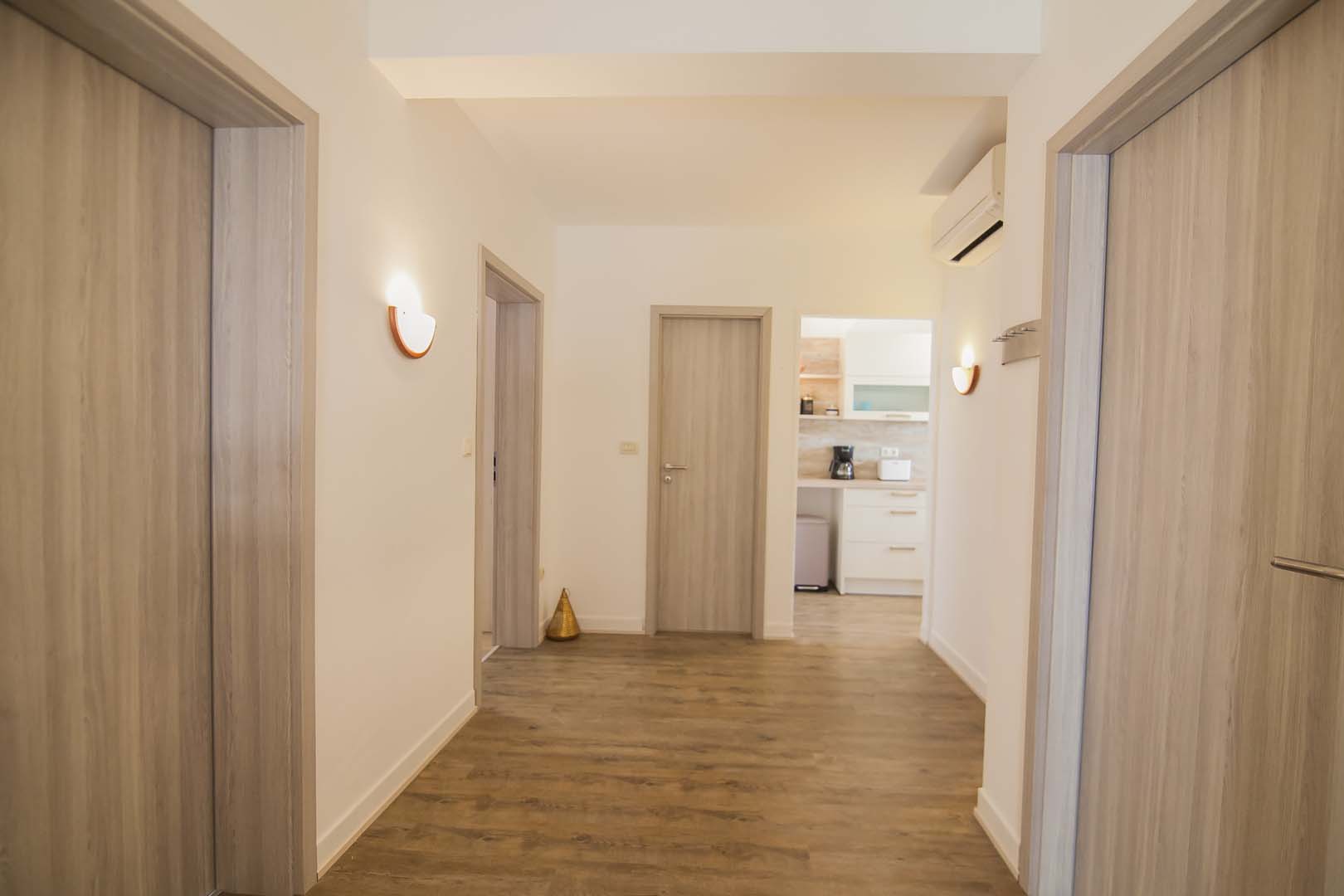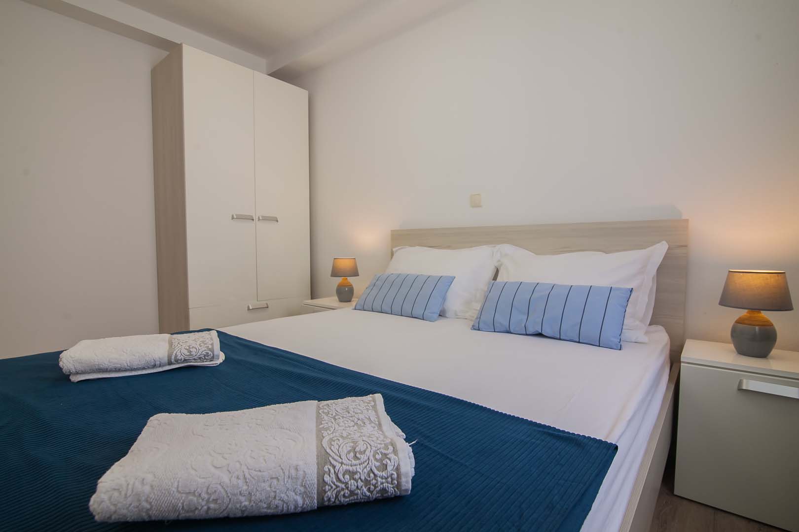 Sastoji se od 2 spavaće sobe ,od kojih jedna ima izlaz na Balkon sa pogledom na more, dnevnim boravkom koji ima izlaz na veliku terasu sa predivnim pogledom na more , 2 kupaonice sa staklenim tuš-kabinama, kao i moderne nove kuhinje sa štednjakom perilicom za posudje , hladnjakom sa zamrzivacom.